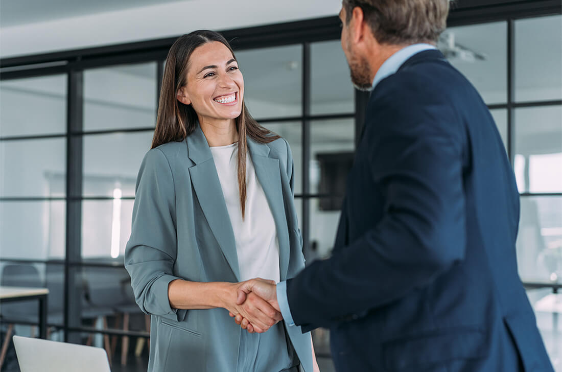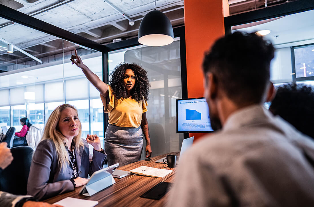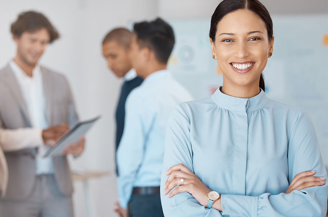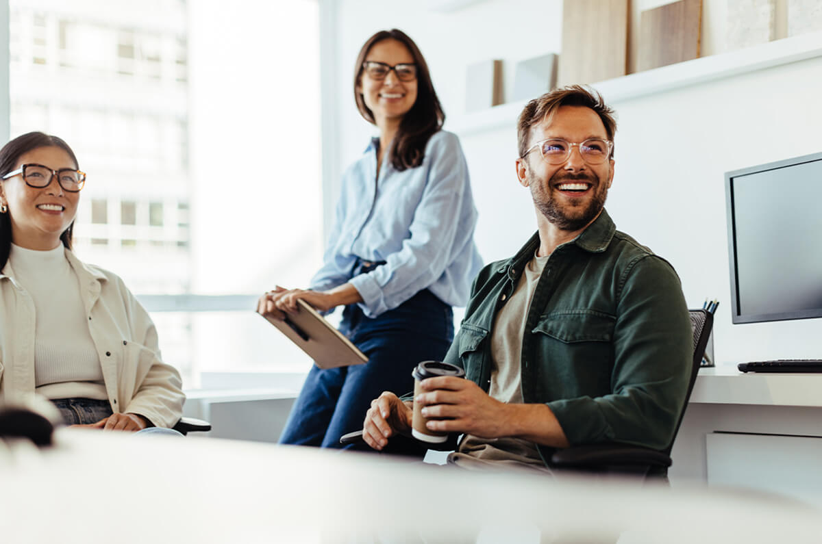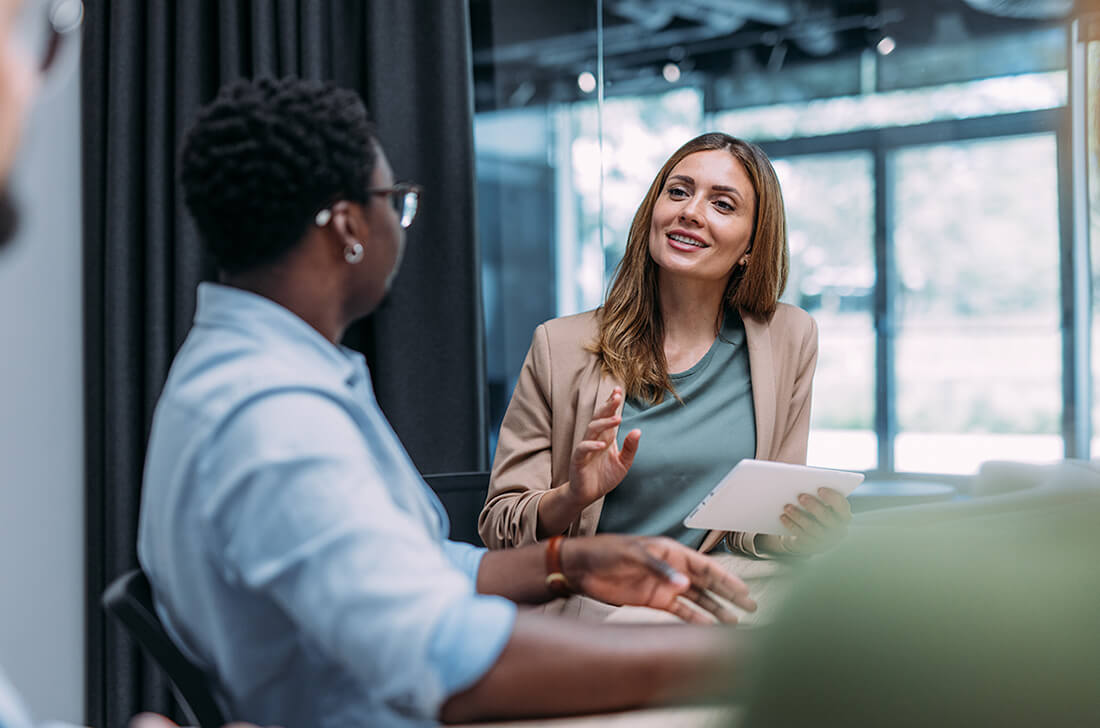 Black-and-white image of a smiling person seated at a table with a blurred background of people in discussion. Surrounded by colorful, abstract geometric icons in a circle arrangement.
