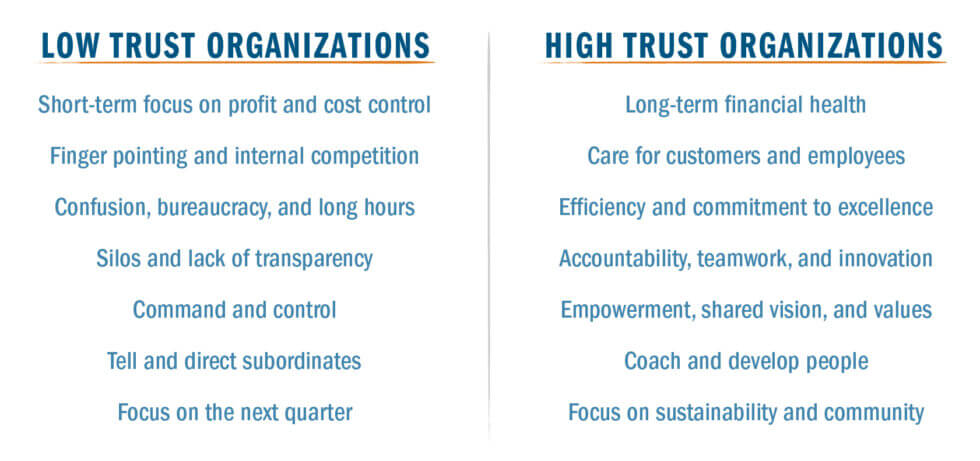 Roughly three of four organizations face some version of the culture gap. And generally, this gap can be traced to a single underlying element: trust. I’ve outlined the characteristics of low-trust organizations vs. high-trust ones. Do any of these common culture gaps sound familiar?