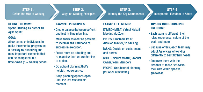If you want to engage associates in adopting Agile Sprints, then empower them with the freedom to make behaviors their own within specific guidelines. As a leader, encourage teams to design these activities to maximize capacity for new strengths. Get “meta” with Agile by not only pivoting through the work, but also pivoting the way you work to take advantage of changes in tasks, teams, roles, environments, and pacing. In the end, this is just one example of the new normal we are all adapting to, and the need to adapt will long outlast our current COVID-19 context.