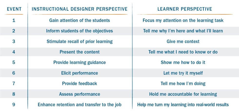 I encourage you to go through all nine of Gagné’s events, reframing each from the perspective of the learner sitting in a classroom or in front of their computer. How might rethinking the nine events change how you design and develop instructional content?