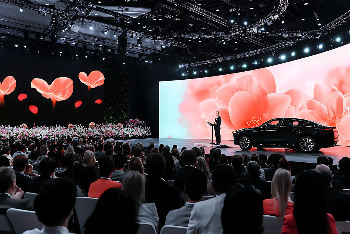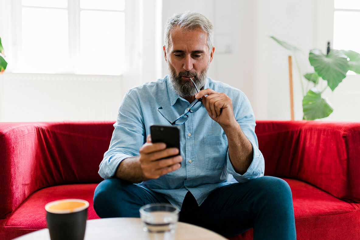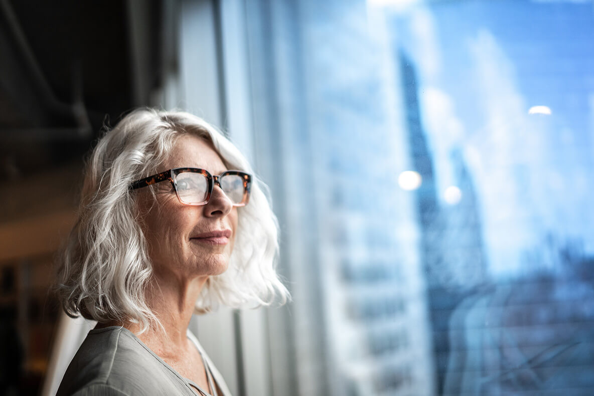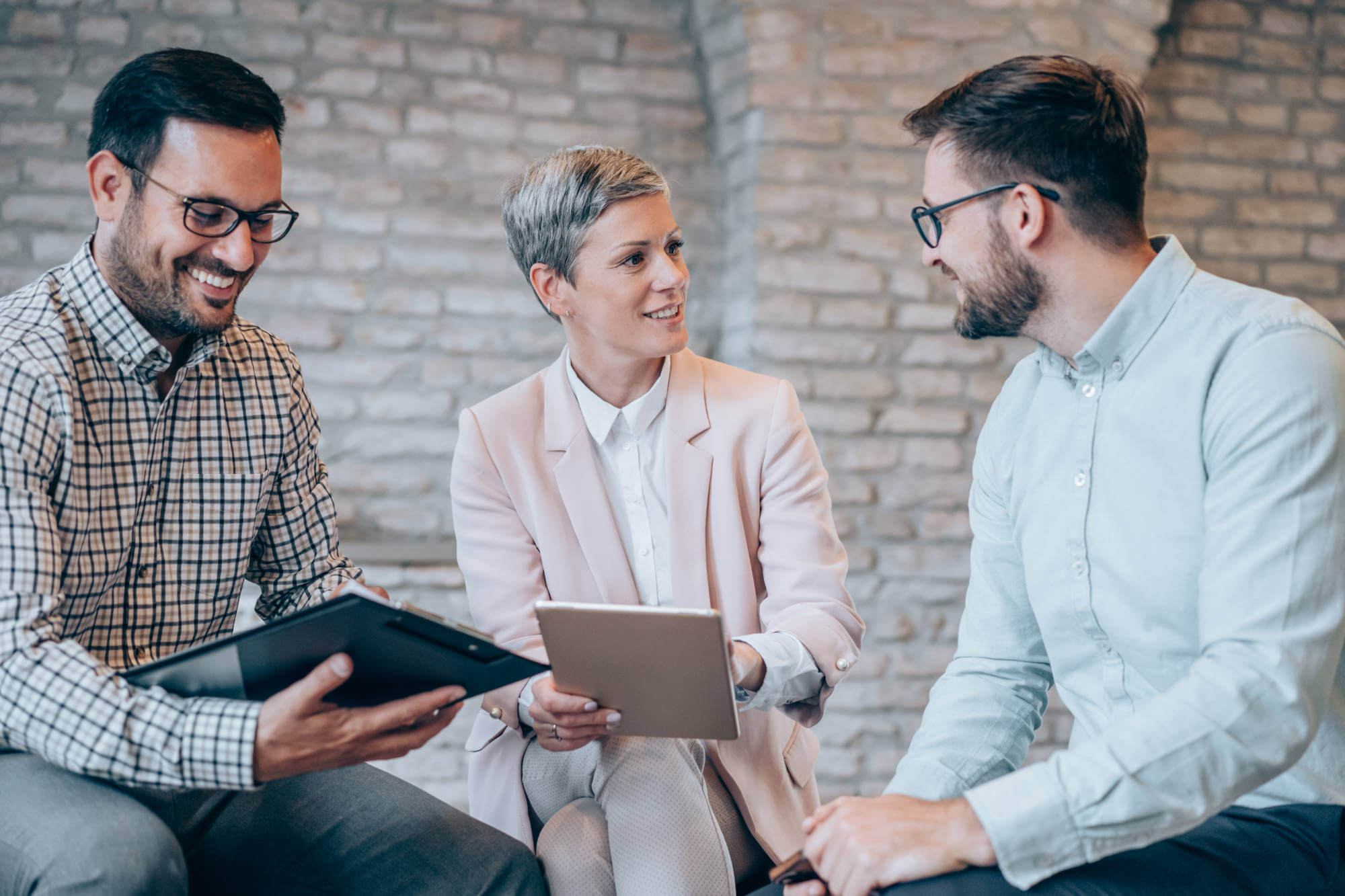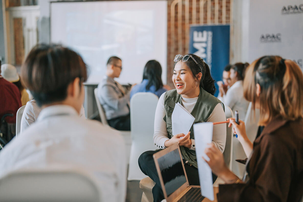 Black-and-white image of a smiling person seated at a table with a blurred background of people in discussion. Surrounded by colorful, abstract geometric icons in a circle arrangement.