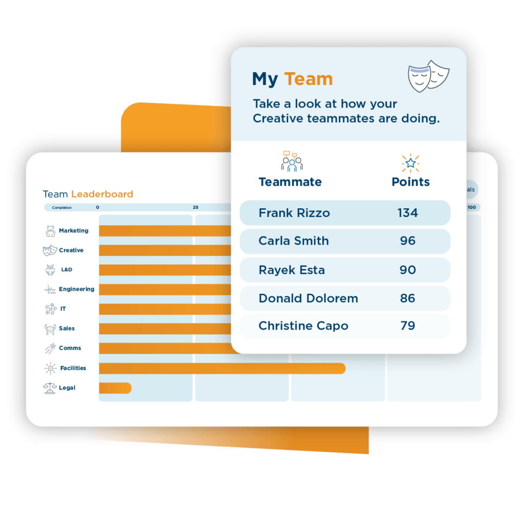 It fuels playful competition. With leaderboards that post real-time team status, your players will be motivated to engage in the activities that score points for their team—and you get real-time adoption metrics.