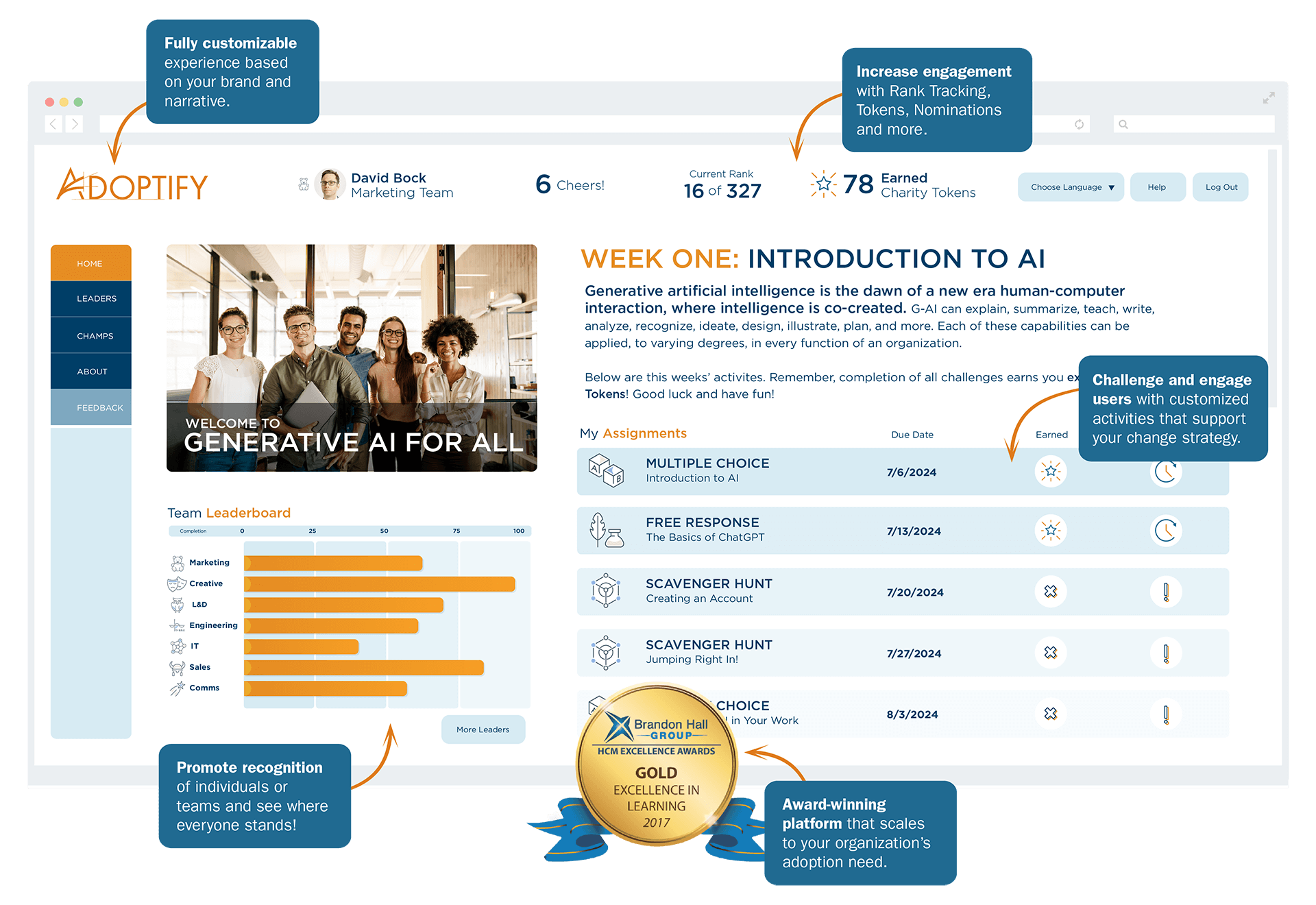 It inspires, recognizes, and tracks change champions. Adoptify gives everyone a chance to pitch in—and be celebrated for their efforts—so you always have a pulse on who is championing change organically.