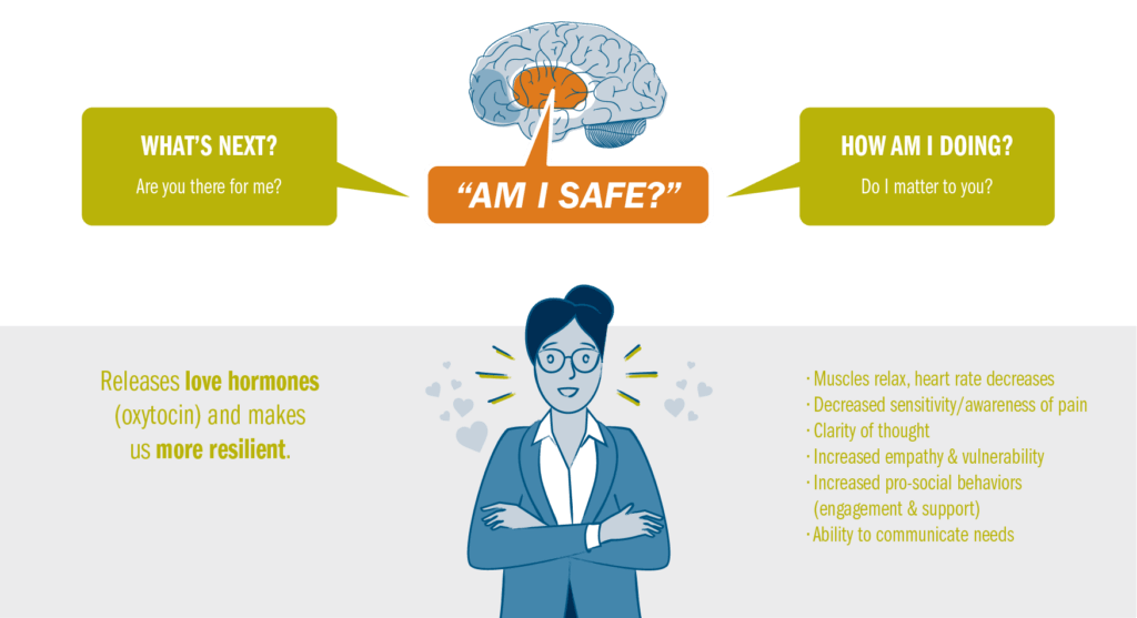 Therefore, if your team members (based on their past experiences) don’t feel instinctively safe, they will always revert to the behavior they’ve learned as protective strategies to maintain equilibrium. In this space you will not find creativity, innovation, or the initiative to take on new responsibilities because the brain is spending A LOT of extra resources trying to manage their internal experience.