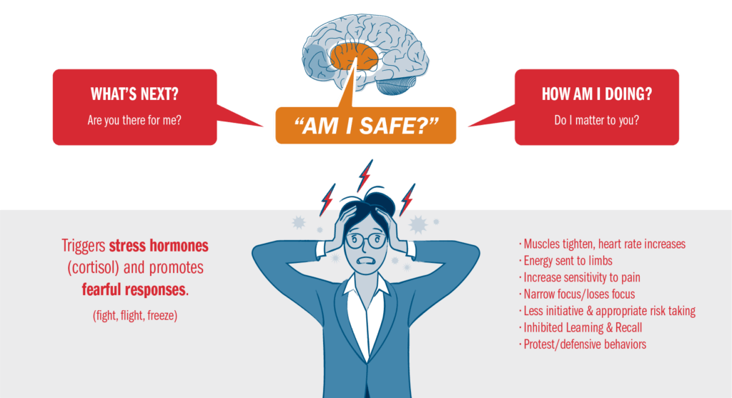 We take the same brain with us from our personal lives to our work lives. Our limbic system, which is highly attentive to danger, doesn’t know the difference between work and home. Our lived experiences are how the limbic system learns to connect different situations with safety or danger. Encountering a bear in the wild would trigger a limbic response—your pulse races, cortisol is released, your breathing changes—the same way it does when the boss asks you to “come in and close the door” or calls your name in a large group. This may seem strange to some, but very real to others because we’re all triggered in different ways. But one thing that’s true for all of us is that the limbic system assumes false-positives, which means it’s hypervigilant in its desire to keep you safe. In the same way we may have a fear response to a long slender stick in a field because we think it may be a snake, we make mistakes in our interpretation of leaders’ facial expressions and actions because our brain would rather be safe and wrong than dead and right. Behind our need for survival are two core questions: What’s next? and How am I doing? When activated, the limbic system allows us to process little else.
